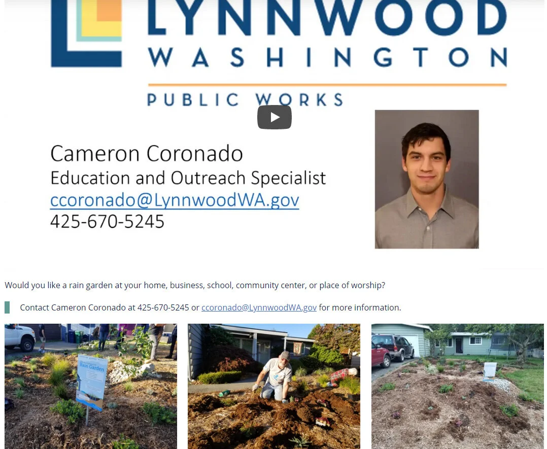 From 10 a.m. to Noon on Saturday, October 17, 2020, stop by the 2018 cluster of rain gardens in Lynnwood. Cameron Coronado from the City of Lynnwood will be on site to answer questions about how rain gardens work. You’ll find him on the corner of 68th Ave. W. and 189th St. SW.